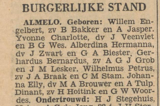 When a birth, marriage, or death was recorded in the civil registration, the municipality published a short message in the local newspaper. These announcements will usually have little information but can confirm a date and place of birth found in other sources. Many newspapers can be found via Delpher. For births, it may only indicate the name of the mother and ‘z’ for zoon [son] or ‘d’ for dochter [daughter]. For marriages, be careful whether the listing is for the ondertrouw [marriage banns] or trouw/huwelijk [marriage]. The announcement may not list the exact date but published all events since the previous publication, which could be up to a week.