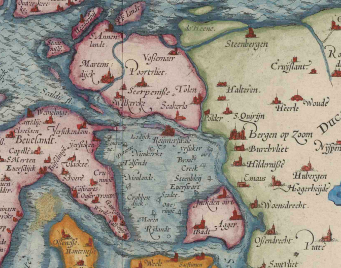 Drowned villages in the land of Reimerswaal, on map of circa 1575. Credits: Jacobus van Deventer, via Wikimedia Commons (public domain)