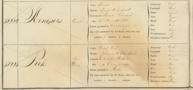 In this example we see the first columns of the military service records of Gerrit Kempers and Jan Derk Piek, who served as conscripted soldiers in the 7th Infantry Regiment from 1849 until 1854. Gerrit Kempers’s entry lists his height as 1 el, 5 palmen, 7 duimen, 3 strepen, indicating a height of 1.573 meters (5’2). My ancestor Jan Derk Piek was 1 el, 5 palmen 9 duimen and [blank] strepen, 1.59 m (5’2.5).