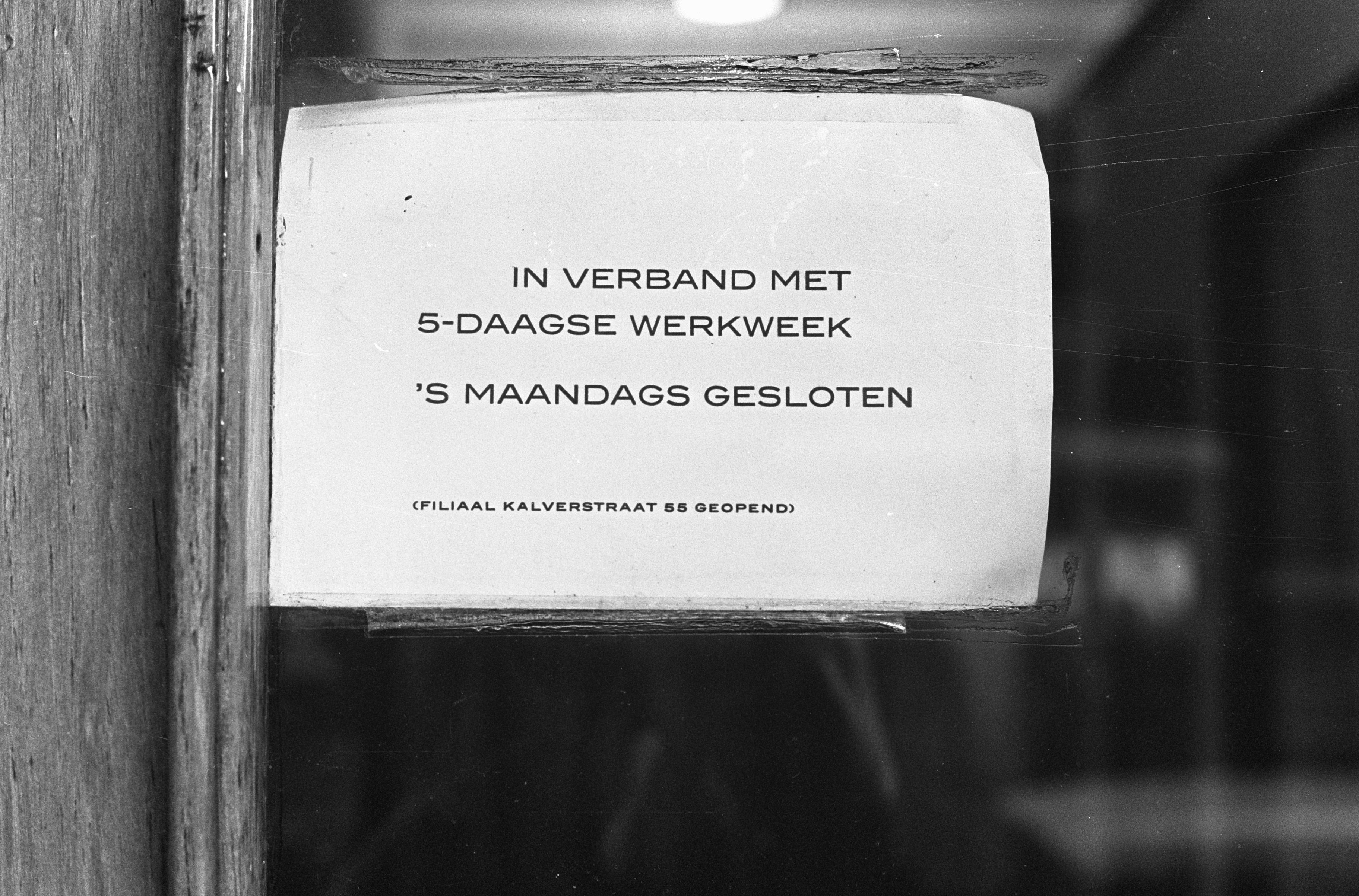 Sign saying the store is closed on Mondays because of the introduction of the five-day-workweek. Credits: Ben Merk, collection Nationaal Archief (CC-0)