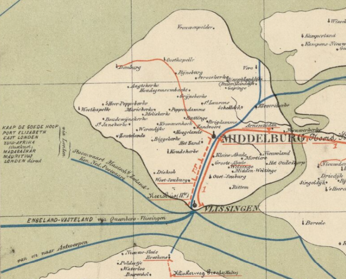 For people tracing emigrants in this period, the map provides information about regular services to different countries. From Vlissingen, people could sail to London, and from there to Cape of Good Hope, South Africa, Madagaskar, and Mauritius. The map indicates the shipping companies that operated these lines: The Stoomvaart Maatschappij “Zeeland” [Zeeland shipping company] and the Koninklijke Nederlandse Postvaart [Royal Dutch Postal Sail Service]. Knowing the companies can help you track passenger lists or ship’s logs.