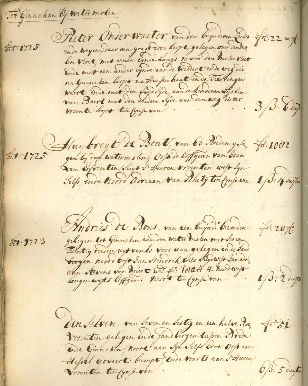Page from the rent register of Ginneken and Bavel of 1725. Scan provided by Twan van den Broek (public domain)