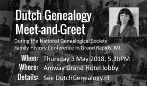 The National Genealogical Society Family History Conference will be held in Grand Rapids, Michigan from 2-5 May 2018. Several presenters including myself will be giving talks about Dutch Genealogy (see the full program). I have already heard from several blog and newsletter readers who plan on coming and can't wait to meet you there. To be able to meet as many of you as I can and to give you a chance to meet each other, I am inviting all Dutch Genealogy readers to come to a meet-and-greet on … [Read more...]